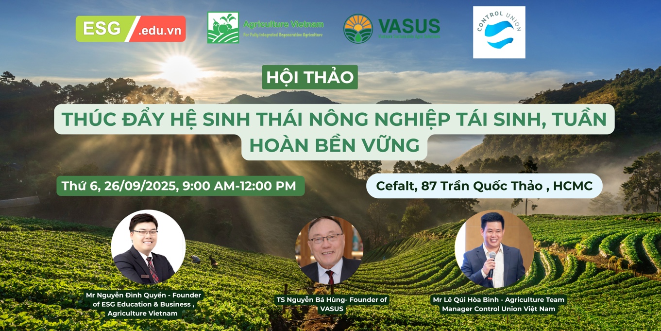 TP. Hồ Chí Minh, ngày 26/09/2025 — Hội thảo “Thúc đẩy Hệ sinh thái Nông nghiệp Tái sinh — Tuần hoàn Bền vững” đã diễn ra thành công, quy tụ các chuyên gia hàng đầu trong lĩnh vực ESG, nông