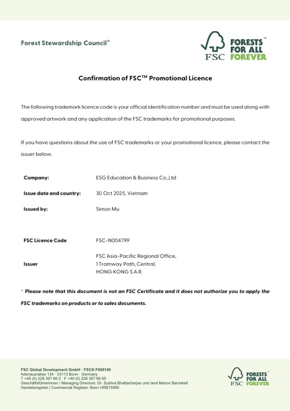Công ty TNHH ESG Education & Business chính thức được cấp Giấy phép Quảng bá FSC™ (Mã giấy phép: FSC-N004799) bởi Hội đồng Quản lý Rừng Thế giới (Forest Stewardship Council™ – FSC™), thông qua Văn phòng Khu vực Châu Á – Thái Bình Dương tại Hồng Kông.