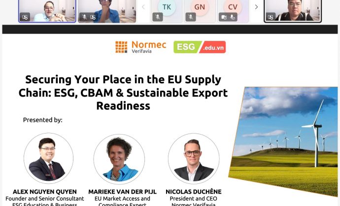 ESG Education & Business hân hạnh thông báo đã phối hợp cùng Normec Verifavia tổ chức thành công sự kiện trực tuyến với chủ đề ESG, Cơ chế điều chỉnh biên giới carbon (CBAM), Nâng cao năng lực xuất khẩu bền vững và Hệ thống giao dịch khí thải EU trong lĩnh vực hàng hải (EU ETS Maritime). Chương trình đã thu hút sự quan tâm của nhiều doanh nghiệp xuất khẩu, nhà quản lý và các bên liên quan, nhằm thảo luận về tác động sâu rộng của các quy định thương mại mới từ Liên minh châu Âu (EU) đối với hoạt động xuất khẩu, đặc biệt là tại Việt Nam.