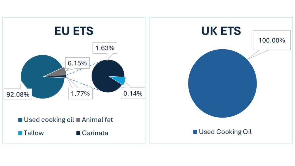 Vào năm 2024, nhiều loại nguyên liệu đã được sử dụng để sản xuất SAF cung cấp cho các nhà khai thác máy bay theo chương trình ETS của EU và ETS của Vương quốc Anh. Những nguyên liệu này đóng một vai trò quan trọng trong hiệu suất môi trường của SAF và tiềm năng giảm lượng khí thải hàng không của nó. Nguyên liệu được sử dụng phổ biến nhất là dầu ăn đã qua sử dụng (UCO), tiếp theo là mỡ động vật, carinata và mỡ.