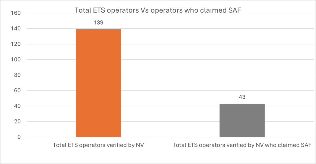 Như đã đề cập trước đó, Normec Verifavia đã xác minh khoảng 46 triệu tCO₂ lượng khí thải được báo cáo cho 139 nhà khai thác. Trong số này, 43 nhà khai thác tuyên bố giảm lượng khí thải từ việc sử dụng SAF. Như thể hiện trong biểu đồ trên, các tuyên bố giảm SAF đã được xác minh này đại diện cho một phần nhỏ trong tổng lượng khí thải đã được xác minh. Phân tích gần đây của chúng tôi đã tiết lộ một số thông tin chi tiết thú vị về các tuyên bố SAF này, hãy đọc để tìm hiểu thêm.