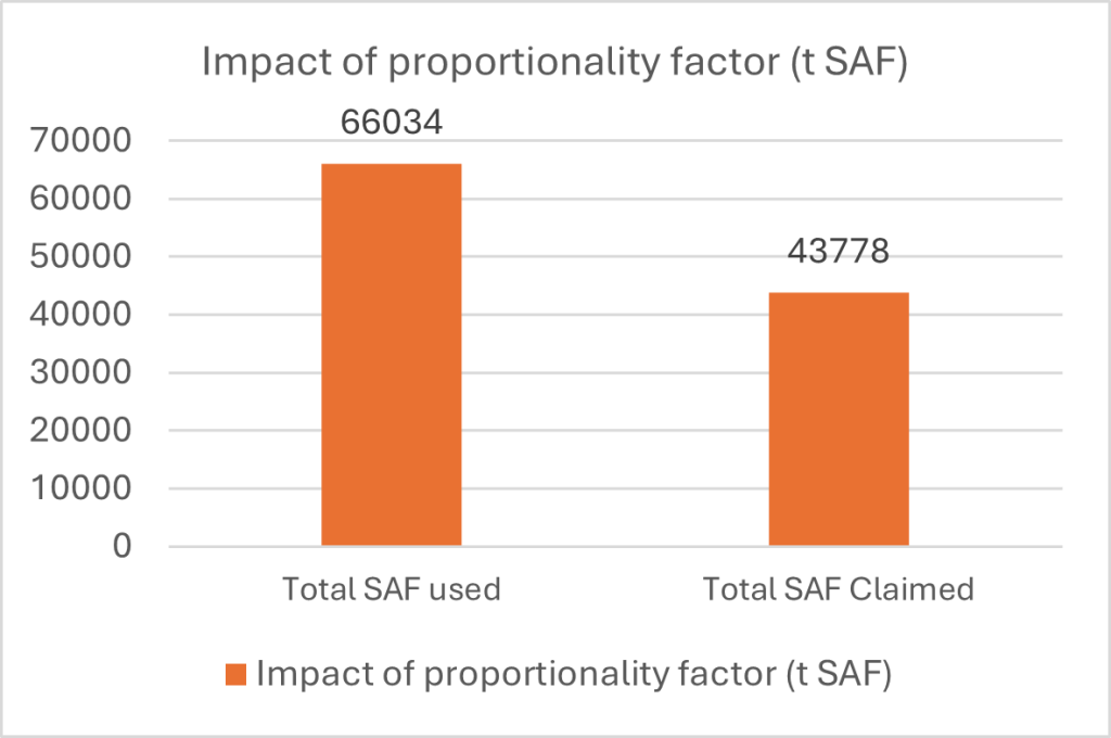 Điều này có nghĩa là nếu một phần lớn lượng khí thải của nhà khai thác từ các chuyến bay khởi hành từ sân bay nằm ngoài phạm vi giảm, hệ số tỷ lệ của chúng và do đó lượng SAF mà họ có thể yêu cầu, sẽ giảm tương ứng. Do đó, nhiều nhà khai thác không thể yêu cầu 100% SAF mà họ đã sử dụng tại một số sân bay nhất định, do hệ số tỷ lệ điều chỉnh yêu cầu để phản ánh tỷ lệ khí thải thực tế được đề cập trong chương trình.